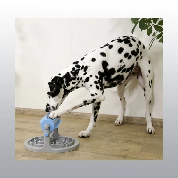 Lorsque l’animal le fait rouler, les friandises tombent dans la gamelle anti-glouton.