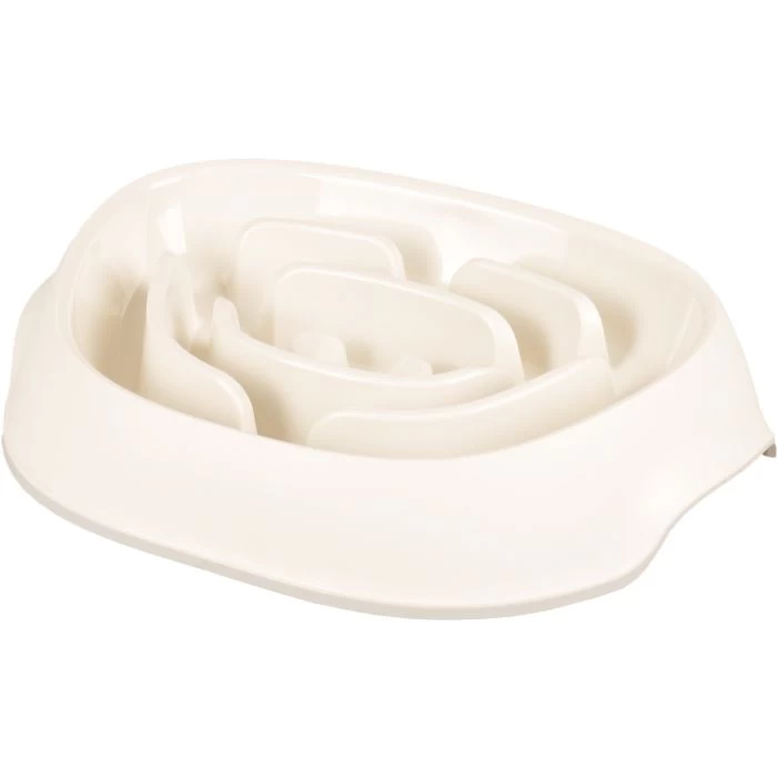 Le Slowfeeder d’Exqi, de couleur blanche, comporte des parois verticales, ce qui a pour but d’inciter votre chien ou votre chat à manger moins vite. Le bol est conçu pour que l’animal mange plus lentement et que le repas lui-même devienne une petite aventure. L’anneau antidérapant sous le bol lui permet de ne pas glisser.