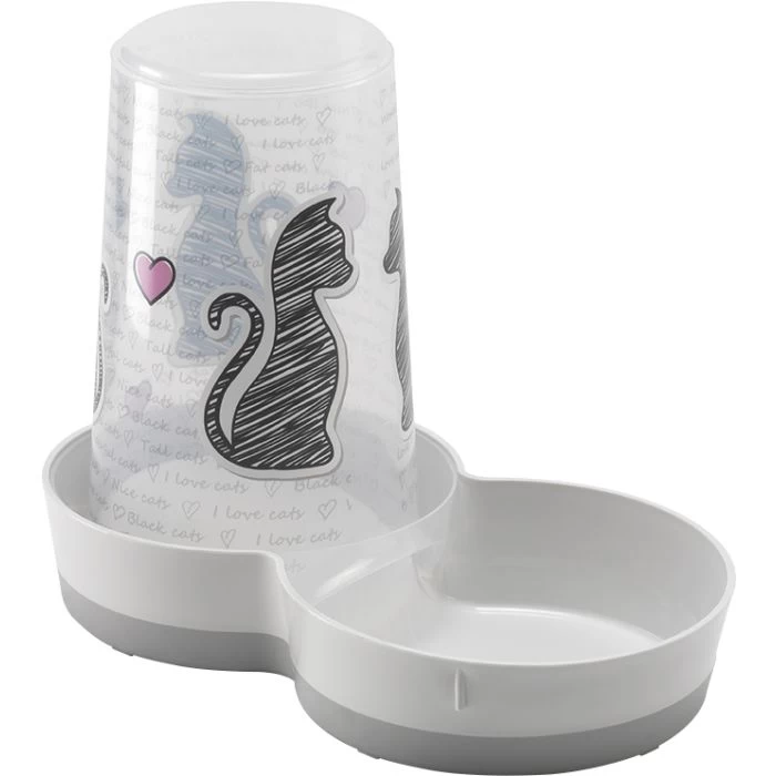 Le Cats Feed/Drink Cats In Love est un bol à nourriture et un bol à boisson pour votre chat. Un produit multifonctionnel.