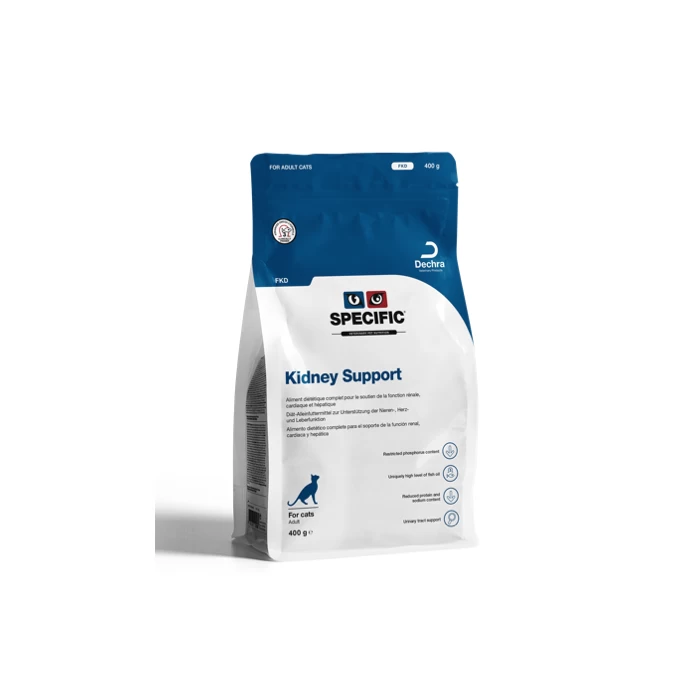 Les croquettes et les barquettes SPECIFIC FKD Kidney Support sont hypoprotĂ©iques et hypophosphorĂ©es et destinĂ©es aux chats souffrants d‘insuffisance rĂ©nale chronique (IRC) ou de calculs d’oxalates, urate et cystine.
