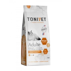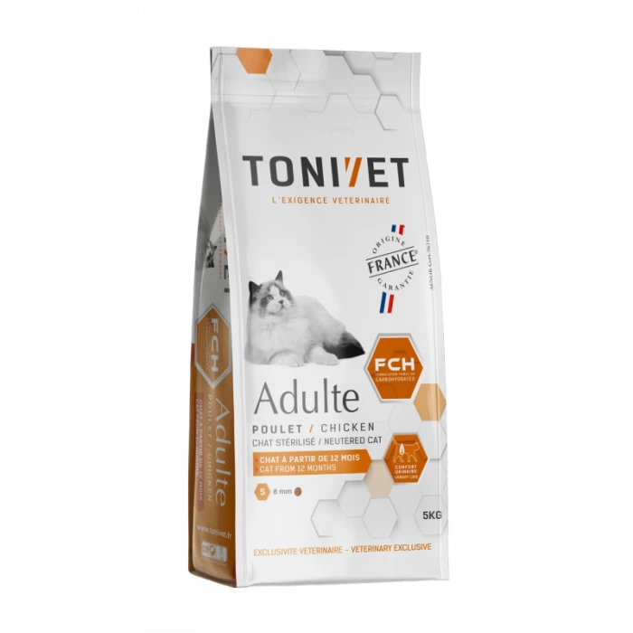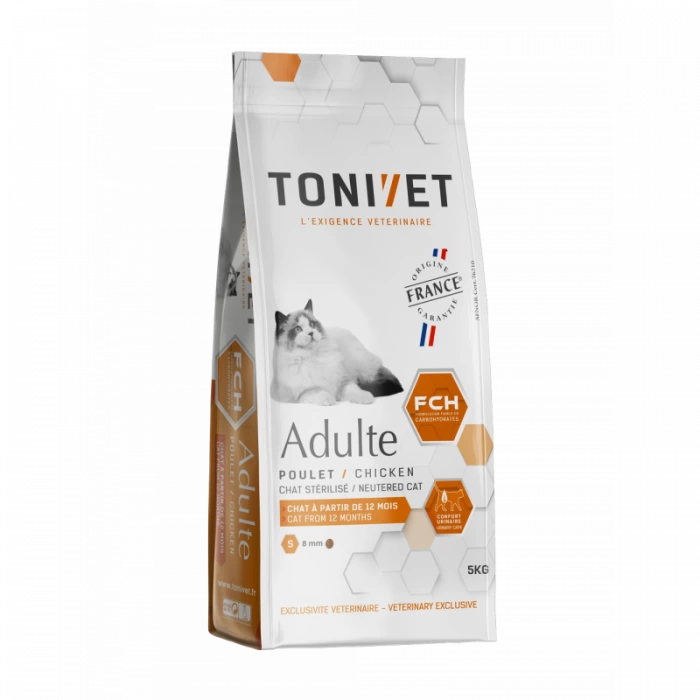 TONIVET CHAT ADULTE POULET apporte tous les nutriments nécessaires au chat adulte grâce à un apport énergétique – protéique optimal et possède une taille adaptée à leur morphologie. Il contribue à une digestion optimale et aide au bon équilibre de la flore intestinale.