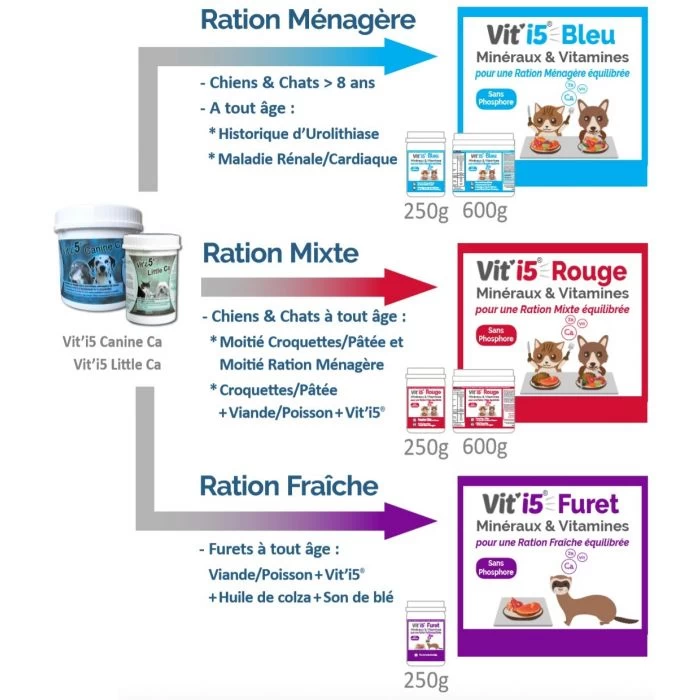 Une ration mixte manque de certains minĂ©raux et vitamines, mĂŞme si le chien ou le chat consomme un aliment industriel, un peu de fromage, de yaourt ou de lait. Il est indispensable Ă leur santĂ© de leur apporter Vit’i5 Rouge tous les jours.