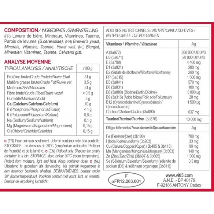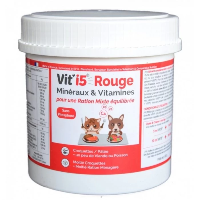 Vit’i5 ROUGE est formulĂ© spĂ©cifiquement pour Ă©quilibrer en minĂ©raux, vitamines et oligo-Ă©lĂ©ments l’alimentation mixte des chiens et chats.